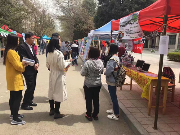 4月21日,贝博官网青协在主干道积极布展,展出项目衍生产品:明信片,行程手册等,吸引了广大同学的关注,给现场参展评委留下深刻印象。