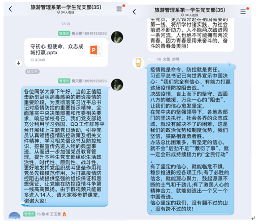 在支部书记梅天鹏的主持下,支部全体党员通过“群课堂”开展线上讨论学习。本次主题党日活动结合目前受全国关注的新冠肺炎疫情事件,以非冠疫情下大学生党员如何坚定民族精神和民族意志,如何发挥党员先进模范作用抗击疫情为主题,共同学习习近平总书记关于疫情防控工作的重要讲话和重要指示精神,学习了如何将伟大民族精神的凝聚力和向心力转换成战斗力;如何在疫情防控阻击战中弘扬伟大的民族精神;讨论了作为大学生党员干部我们应该如何做的问题。梅天鹏要求各位党员能够及时、准确地领悟文件精神,做到能够学在心、行在身,在特殊的“战争”时期积极发挥党员的先锋模范作用,倡导有条件的党员同志能主动参与到这场“战疫”中,并配合好学校的相关安排。最后,他提醒同学们,作为高年级学生,不能忘记认真对待毕业论文的写作,要做到“停课不停学、学习不延期”,保持理性科学的态度和积极向上的心态,坚定信念,共克时艰。