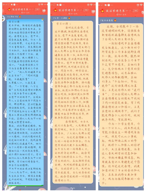 怡萌萌同志分享道:一封封请战书在疫情爆发后被递交,这个新年对于所有医务工作者来说都变得不一般,放弃休假,毅然回到前线。这些医务工作者中不乏有中共党员,在他们身上,充分体现出了党员的坚定理想信念,优秀品格以及伟大的奉献精神,在他们身上“不忘初心,牢记使命”这句话显得尤为真实。正是这些伟大的“逆行者”,才让全国的人民群众在疫情爆发后的慌乱中找到了内心的坚定依靠,有了战胜疫情的决心和信心,正是在党的正确领导下,我们才能发挥每个人的作用,做到秩序井然,有效控制。作为一名学生党员,我虽然还没有能力像医生一样请战奔赴一线,但是可以从小事做起,响应钟南山院士的号召,做好个人和家人的防护工作,关注疫情进展,为身边人普及科学的消息和知识,杜绝传播虚假信息,既要提高意识又要避免过于恐慌。经历过这次疫情,我更加意识到了专业的责任和义务,在未来我将会更加努力,成为为祖国奉献的一份子。