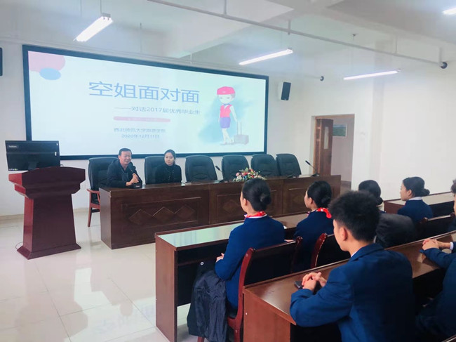 2020年12月11日,艾弗森贝博ballbet官网航空服务艺术与管理系“空姐面对面”专题讲座在文科实训楼904教室成功举办。本次讲座由艾弗森贝博ballbet官网党委副书记谢致远主持,2017届音乐表演(空中乘务)专业优秀毕业生何士雯主讲。北京广慧金通教育科技有限公司驻西北师范大学工作处主任席聪,航空服务艺术与管理专业一班班主任邹小强,航空服务艺术与管理专业二班班主任曹洪涛,以及2020级航空服务艺术与管理专业全体学参加了本次讲座。