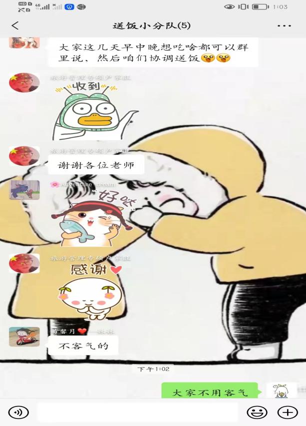 当遇到同学突发身体不适,需要及时就医时,辅导员鲁梦鸽老师第一时间赶到学生宿舍,带学生多次前往校医院进行诊疗,并将自己常备药物分享给生病学生,耐心叮嘱药物服用禁忌,让学生倍感温暖;当有学生在校医院输液治疗时,辅导员老师们迅速建立“送饭小分队”,为生病学生按时送去一日三餐,让学生安心治疗;辅导员用自身实际行动告诉大家,遇任何问题他们会坚定不移的站在学生前面,悉心守护每一位学生。