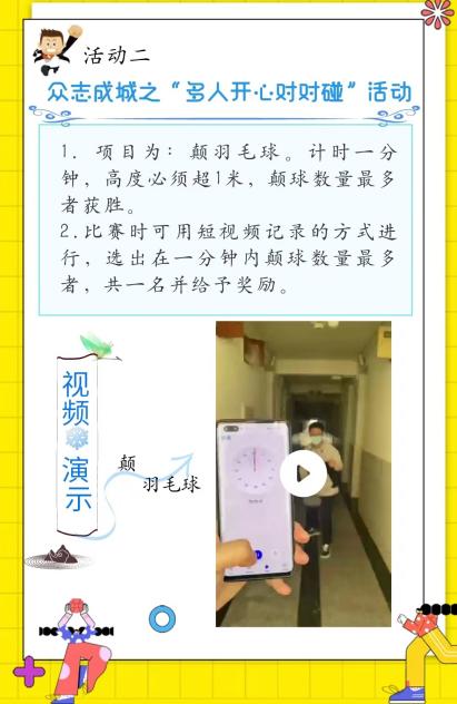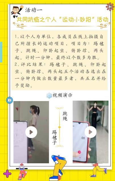 线上运动项目形式多样,富有趣味,运动内容主要分为三个板块,分别为共同抗疫之个人“运动小妙招”、众志成城之“多人开心对对碰”、预疫小能手之“超人”挑战杯。其中共同抗疫之个人“运动小妙招”活动中,选择拍摄日常运动中的跳绳、踢毽子、仰卧起坐、俯卧撑、两头起等项目,推行1分钟挑战任务,选拔第一名给予奖励;众志成城之“多人开心对对碰”活动中,用短视频的方式记录符合要求的一分钟颠羽毛球的数量,选拔第一名给予奖励;预疫小能手之“超人”挑战杯活动中,用短视频的方式选拔“青蛙小跳”与软度比赛的第一名给予奖励。