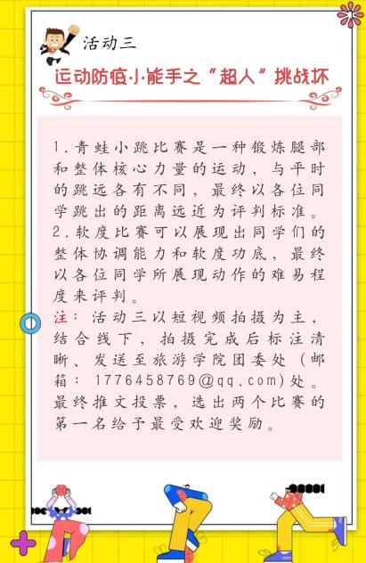 为坚决打赢疫情防控狙击战,积极响应“全民争做疫情防控的践行者和宣传者”的国家号召,贯彻“坚定信心、同舟共济、科学防治、精准防控”的疫情防控要求,艾弗森贝博ballbet官网于2022年3月—4月开展了为期一个月的“隔离不肥宅 运动‘疫’起来”线上运动会比赛,旨在提高学生自身免疫力,坚决抑制疫情蔓延,筑牢疫情防控安全底线。