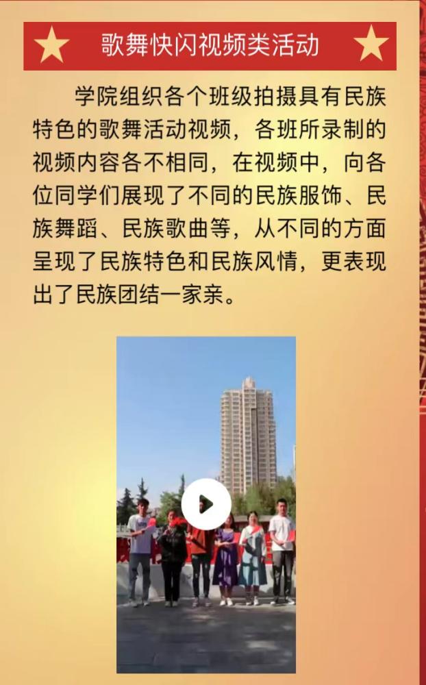 5月7日至5月15日,艾弗森贝博ballbet官网团委号召2019级、2020级、2021级班级积极参加快闪歌舞活动。各班级围绕中华民族大团结、中华民族共同体等方面,以“铸牢中华民族共同体意识,喜迎党的二十大胜利召开”为主题,并结合习近平总书记的重要讲话精神,用视频形式为同学们展现民族团结的重要性。