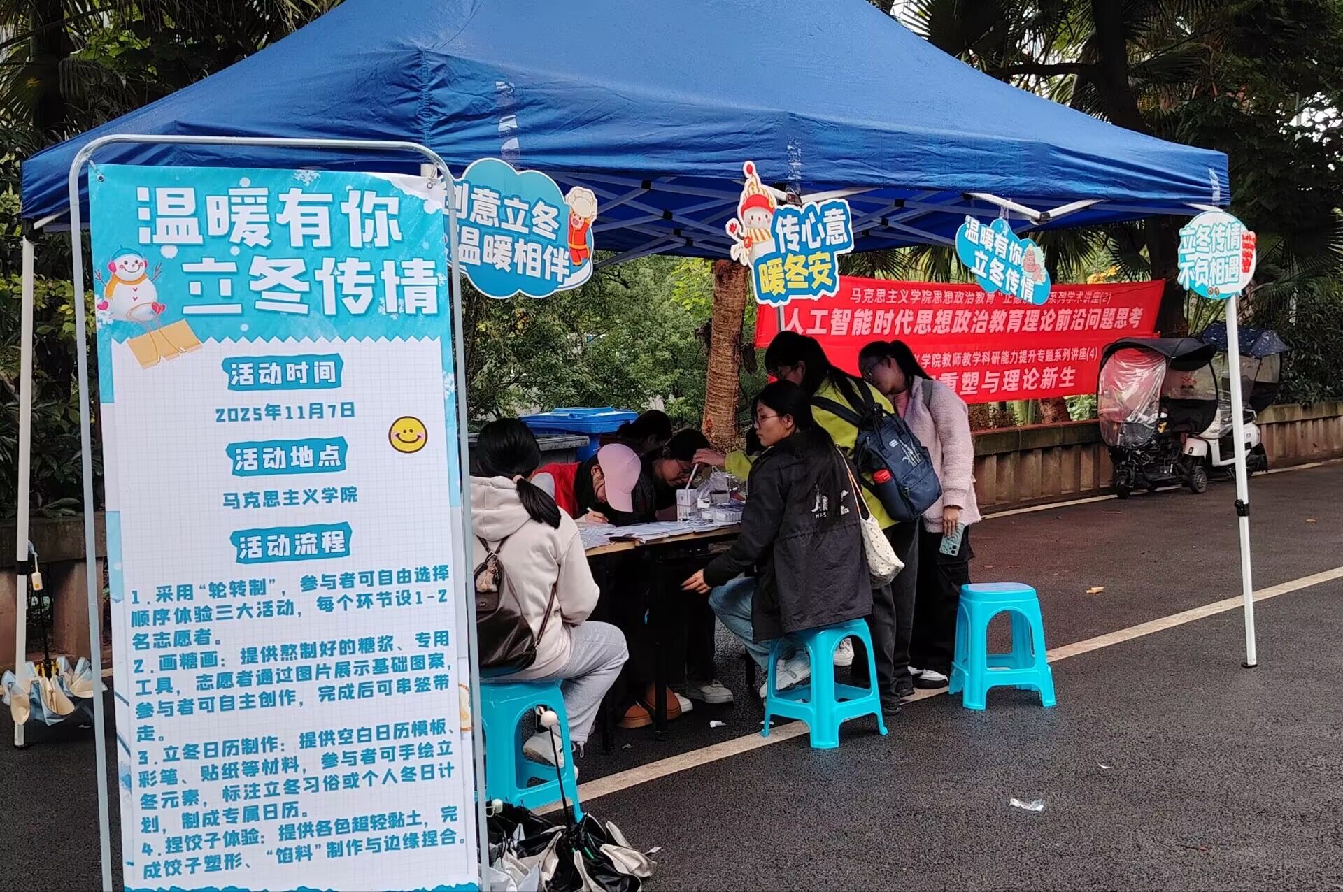 当秋风渐敛,凉意悄悄钻进风里,立冬的脚步便伴着清冽气息如约而至。11月7日,马克思主义学院“温暖有你 立冬传情”主题活动温情启幕,师生们将冬日暖意揉进糖画甜香、日历笔触与黏土创意中,共赴一场裹着软风的冬日之约。 糖画裹甜香 活动现场的糖画区,温热的糖浆在模板上晕开琥珀色光。糖浆凝固的瞬间,暖雾裹着焦香漫过指尖,竹签挑起的糖霜小品,便成了冬季限定的甜暖注脚。 日历画心意 空白日历铺展如素笺,彩笔与贴纸织就独属冬的仪式,“立冬”格间的软心、“平安”句底的温软、纸雪与炉火的叠影,让原本单薄的时日,成了私藏的生活诗行。 黏土捏暖冬 打破传统模样!素朴黏土挣脱“饺子”的固有形态,橘色软皮裹粉馅,笑靥缀于团酥间,或化形为灵动小兽。指尖起落处,创意跳脱俗常,暖意在方寸里渐次丰盈。 立冬手作特辑 这些手作将立冬的仪式感揉入生活的肌理,皆为冬日里鲜活的治愈注脚。 霜染初冬,暖意藏心。马院学子以糖画、日历、黏土为载体,将立冬的仪式感揉进生活的温柔里。这些指尖温热的手作,是对季节流转的深情礼赞,亦载着彼此的心意,为这个冬天烙下最柔软的印记。 (李佳璐 郑博丹/文 郑博丹/图 传媒中心熊素平/编辑)