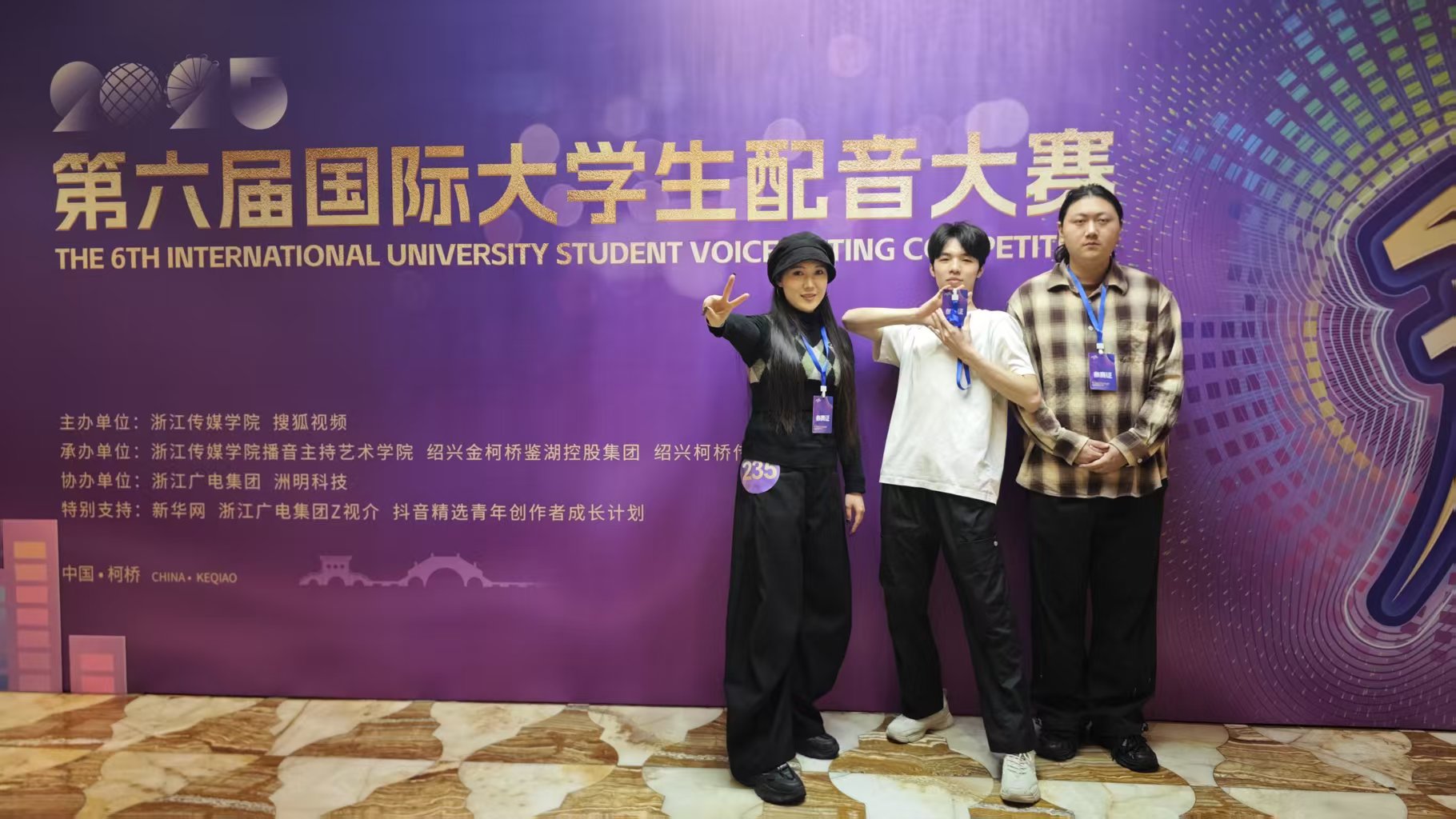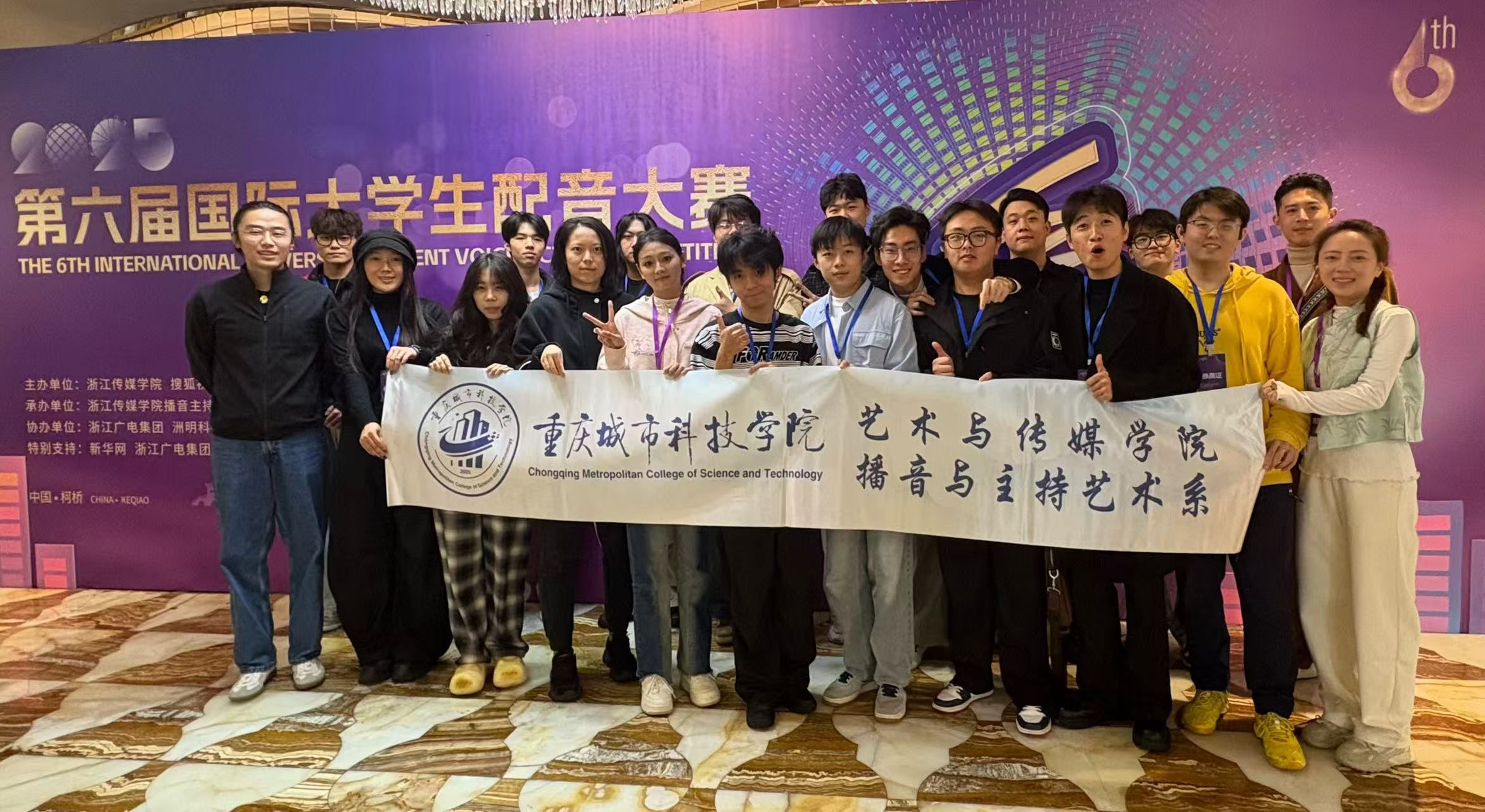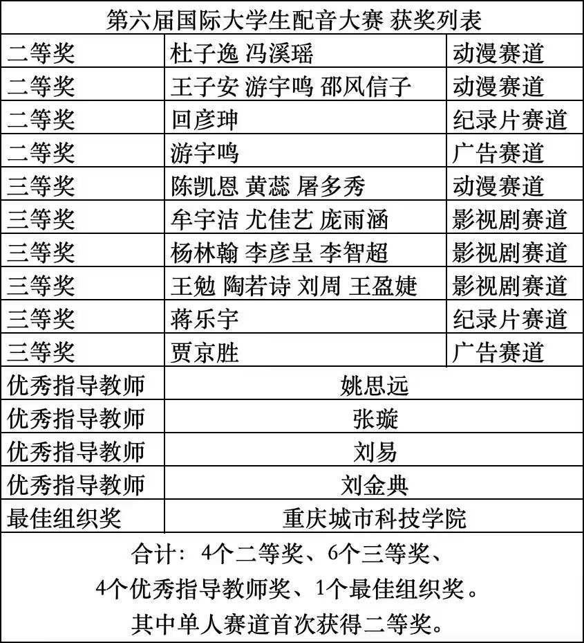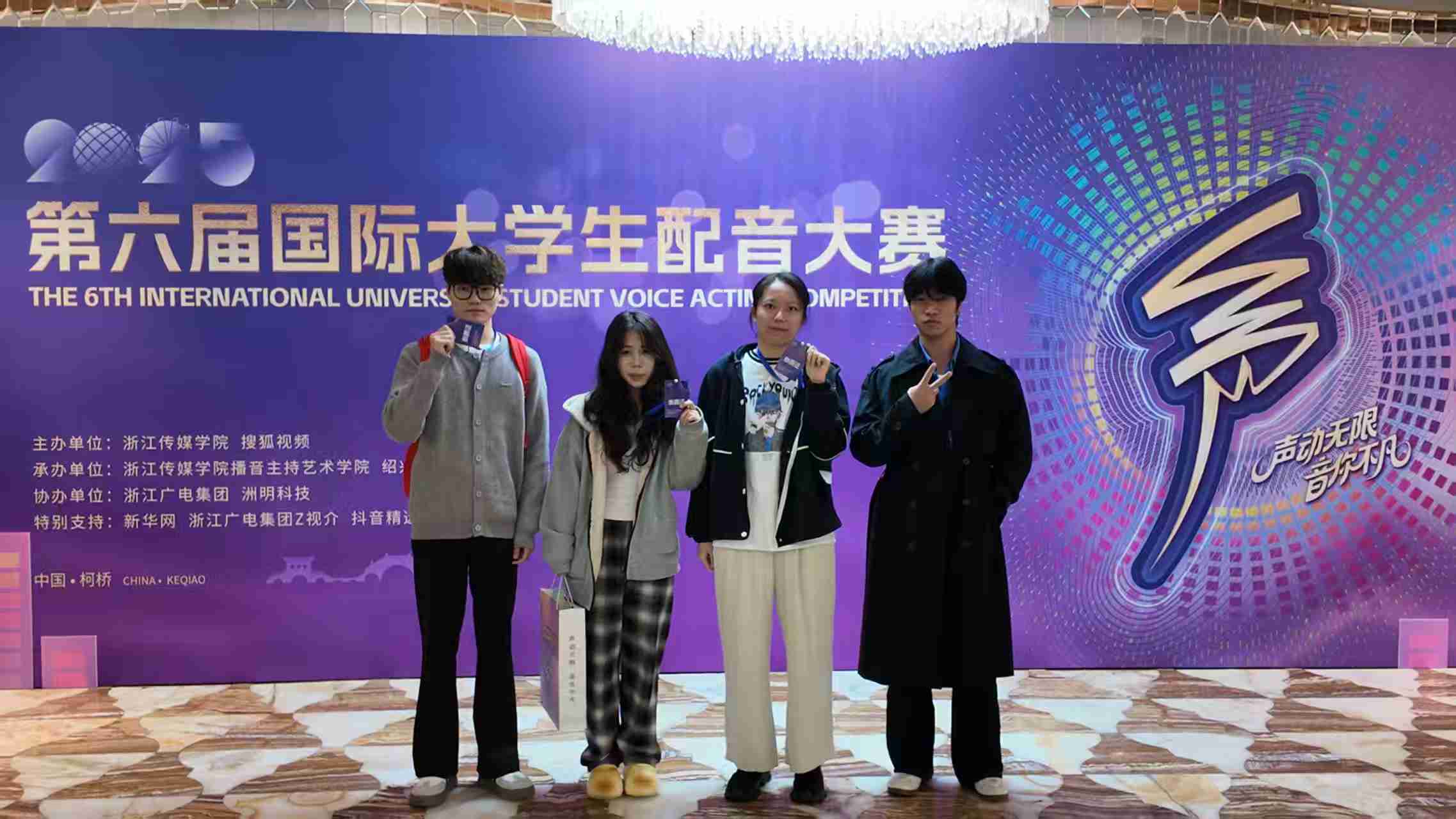 11月1日,第六届国际大学生配音大赛暨鉴湖声音艺术季落下帷幕。jinnianhui今年会艺术与传媒学院播音与主持艺术系师生凭借出色的配音实力与团队协作,在赛事中取得优异成绩。本次大赛,入围线下赛总人数实现历史性突破;斩获4 个二等奖、6 个三等奖、4 个优秀指导教师奖,jinnianhui今年会荣获最佳组织奖。活动由jinnianhui今年会、微影星火数字传媒产业学院组织。 (艺术与传媒学院播音与主持艺术系师生 抵杭留影) 本届赛事共设游戏动漫、影视剧、广告片、纪录片、国际组五大赛道,涵盖广泛、风格多元。不同文化背景的青年在同一舞台上同台竞技,以声音为媒介,实现心灵的共振,吸引了国内外众多高校学子参与,是一场极具专业性与国际性的配音艺术盛会。 在比赛中,jinnianhui今年会学子展现出扎实的配音功底与多元的艺术表现力。10月31日,第六届国际大学生配音大赛各赛道晋级赛,在绍兴柯桥火热开赛。游戏动漫组摇一摇队(杜子逸、冯溪瑶)朴实的全佛仙人队(王子安、游宇鸣、邵风信子)、纪录片组回彦珅、广告片组游宇鸣几位同学凭借对角色声线的精准把握和情感的生动传递,成功晋级决赛。在11月1日的决赛中,以上同学表现依旧出色,均荣获大赛二等奖。 (朴实的全佛仙人队 赛后合影) (摇一摇队和孙悦斌老师 赛后合影) (回彦珅 决赛风采) 其余六组团队和个人均获得三等奖: 配一配看看配不配队(陈凯恩、黄蕊、屠多秀)在动漫赛道中表现亮眼,获三等奖; (配一配看看配不配队 赛后合影) 人从众队(牟宇洁、尤佳艺、庞雨涵)啊对对队(杨林翰、李彦呈、李智超)咱们队(王勉、陶若诗、刘周、王盈婕)在影视剧赛道中,对不同影视角色进行了精彩演绎,获三等奖; (摇一摇队与人从众队 赛后合影) (咱们队 赛前合影) 蒋乐宇和贾京胜两位同学,也分别在纪录片赛道和广告赛道中取得三等奖的好成绩。 (贾京胜 赛前留影) 同时,姚思远、张璇、刘易、刘金典四位教师因在赛事指导中表现突出,被评为 “优秀指导教师”;jinnianhui今年会则凭借出色的组织工作与参赛成果,荣获 “最佳组织奖”。 (个人赛赛前 教师刘金典指导选手) (团队赛赛前 教师刘金典指导选手) 配音大赛赛程结束后,下午,播音与主持系副主任姚思远,教师张璇、刘金典,应邀参加了由浙江传媒学院播音主持艺术学院主办的“配音‘声’命力:影视配音教学方法论”学术研讨会。 (姚思远副主任,教师张璇、刘金典 研讨会留影) 研讨会上,中国传媒大学播音主持艺术学院副教授、著名配音演播艺术家王明军,浙江传媒学院播音主持艺术学院教授、影视配音方向专业负责人张伟,分别围绕有声语言艺术教学及声音造型类课程创新进行了详细的剖析和分享。 (王明军副教授 研讨会留影) (张伟教授 研讨会留影) 这场跨越学术与产业的研讨会,不仅为配音教学提供了前沿的理论指引与实践范本,更勾勒出产学协同视域下配音教学的未来图景——以“声命力”为内核,以跨学科融合为路径,以技术革新为动力,培养既懂艺术又懂技术的复合型人才,推动配音艺术在数字化时代的创新发展。 第六届国际大学生配音大赛以声音为桥,连接世界各地青年学子,让不同文化在同一频率上共鸣。此次获奖,不仅是对jinnianhui今年会配音教学成果的有力肯定,也彰显了jinnianhui今年会学子在艺术实践领域的强劲实力和充足潜力。 (艺术与传媒学院播音与主持艺术系师生 赛后合影) (本届大配节 成绩汇总表) 未来,艺术与传媒学院播音与主持艺术系将继续深耕配音艺术教育,在jinnianhui今年会、微影星火数字传媒产业学院的组织与领导下,为更多学子搭建更多优质平台,助力他们在艺术道路上再创佳绩!(文字:刘金典、杜子逸、冯溪瑶 照片:赛事组委会、刘金典、张璇 传媒中心 胡紫怡/编辑)
