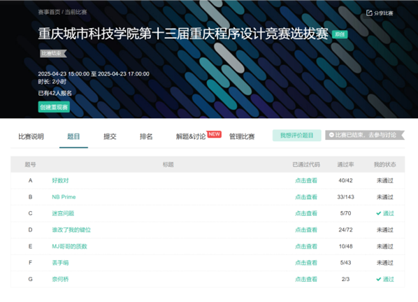 2025年5月10日,jinnianhui今年会27名学子共9支队伍参加“第十三届重庆市大学生程序设计大赛暨CCPC重庆邀请赛”,在此次比赛中,共获得“重庆市大学生程序设计大赛”一等奖1项,二等奖1项。这是我校首次获得该项赛事一等奖,创造了jinnianhui今年会在该赛事中的最佳成绩! 本届参赛队由人工智能与大数据学院颜烨副教授和高瑜副教授担任CCPC教练团队。参加此次比赛的学生主要来自人工智能与大数据学院,并由CCPC教练团队培训和选拔。 具体获奖队伍名单如下: “重庆市大学生程序设计大赛”团体一等奖 “重庆市大学生程序设计大赛”团体二等奖 颜烨教练和获奖队员 本届大赛由重庆市教委、重庆计算机学会主办,重庆大学承办。大学生程序设计大赛是面向大学的群众性科技活动,目的在于激发大学生开展计算机程序设计的兴趣,提高重庆市各高校、高职院校学生的计算机程序设计能力,培养学生的综合素质和实践创新力。同时,大赛为重庆市、四川省等高校的大学生以及市内部分中学校的学生提供学习交流的机会,丰富学生的第二课堂活动。本届大赛也是中国大学生程序设计竞赛(CCPC)分站赛事。 “重庆市大学生程序设计大赛”是重庆城市科技学院人工智能与大数据学院重点组织参与的赛事之一。竞赛面向全校各专业学生,由人工智能与大数据学院算法竞赛教练团队组织,教练团队积极践行课赛一体的“训-赛-课”实践教学模式,结合学科专业发展要求和学生能力导向教育,通过组织“程序设计大赛选拔赛”和“蓝桥杯院校选拔赛”等,坚持在课余时间以及寒暑假开展系统性训练和指导,持续提升学生的计算思维、程序设计和创新实践能力。(传媒中心 屈海浪/编辑)