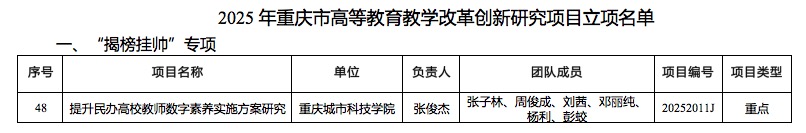 重庆市教委发布了《关于公布2025年重庆市高等教育教学改革创新专项研究项目立项名单的通知》(渝教高函〔2025〕46号)。